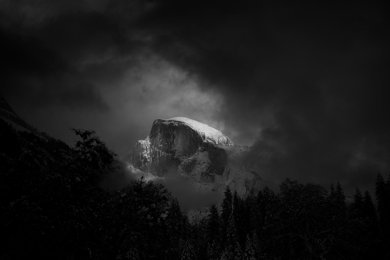 It was pure magic. The clouds suddenly parted, forming a passage in the sky, and sunlight poured through, illuminating Half Dome in radiant light. The scene felt cosmic, as though the universe itself had aligned for this fleeting moment. Everything else faded away—the world ceased to exist—leaving only this moment of profound mystery and awe.