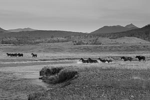 Before I could place it, the earth itself seemed to wake. A roar, deep and rolling, surged toward me. I turned, just in time to see them—two tribes of baguales, wild and untamed, charging through the open expanse. Their hooves carved the earth, water spraying as they tore through the river, their energy boundless, their purpose unknown but undeniable.